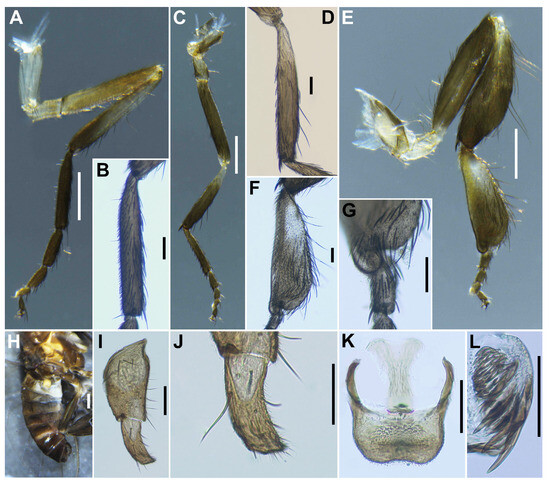 Male of S. trangense. (A) Foreleg; (B) Fore basitarsus; (C) Midleg; (D) Mid tibia; (E) Hind leg; (F) Hind basitarsus; (G) Calcipala, right side, inner view; (H) Abdomen, lateral view; (I) Coxite and style, ventral view; (J) Style, ventrolateral view; (K) Ventral plate and median sclerite, ventral view; (L) Paramere. Scale bars: 0.2 mm for (A,C,E,H) and 0.05 mm for (B,D,F,G,I–L).