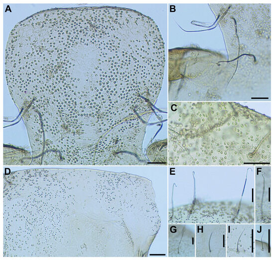 Pupa of S. trangense. (A) Frons and tubercles on frons; (B) Frontal trichomes and facial trichome; (C,D) Tubercles on thoracic integument of anterior (C) and posterior half (D) portions; (E–J) Thoracic trichomes on anterodorsal (E), anterolateral (F,G), mediolateral (H), and ventrolateral (I,J) surfaces. Two types of trichomes are present on anterolateral surface including coiled (F) and uncoiled (G) trichomes. Scale bars: 0.05 mm.
