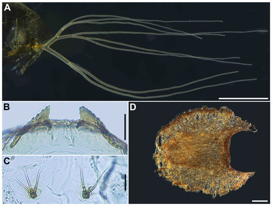Pupa of S. trangense. (A) Gill filaments; (B) Terminal hooks, caudal view; (C) Bifid and trifid hooks on ventral surface of abdominal segment 5; (D) Cocoon, dorsal view. Scale bars: 0.5 mm for (A,D) and 0.02 mm for (B,C).