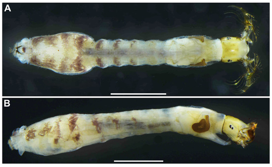 Mature larva (n = 9). Body length 4.3–4.9 mm. (mean 4.6 mm) (Figure 15A,B). Yellowish, first thoracic segment with light gray transverse band unconnected ventrally. Abdominal segments 2–4 each with pair of reddish-brown dorsolateral markings, and abdominal segment 4 also with faint reddish-brown marking ventrally, segments 5–8 each with transverse reddish-brown band on dorsal and dorsolateral surfaces, although those bands on abdominal segments 6–8 often disconnected dorsomedially.