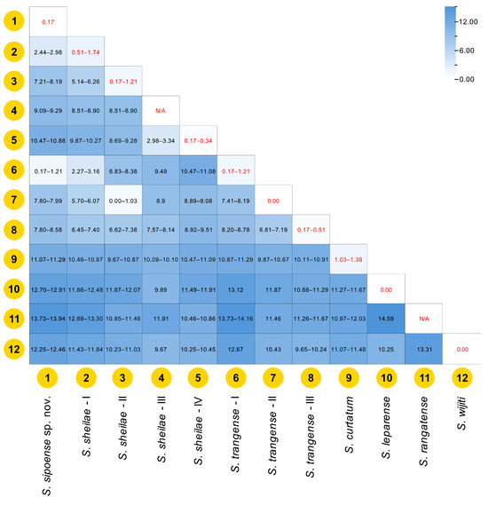 Color heatmap of K2P pairwise genetic distances (%) among species in the S. ceylonicum species-group. The color shading illustrates the maximum genetic distance for each pairwise comparison. Genetic distances are presented as ranges, with intraspecific values shown in red and interspecific values in black.