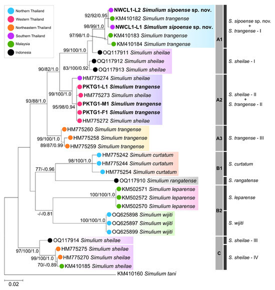 The Simulium ceylonicum species-group, redefined by Takaoka [1], is the fourth largest among 16 species-groups of the subgenus Gomphostilbia. This species-group comprises 26 named species and two unnamed species, most of which are distributed in the Oriental Region, while five occur in the Palearctic region [2]. In Thailand, five species of the S. ceylonicum species-group have been documented, including S. curtatum Jitklang, Kuvangkadilok, Baimai, Takaoka & Adler, 2008; S. pangsidaense Takaoka, Srisuka & Saeung, 2021; S. sheilae, S. trangense, and S. wijiti Srisuka, Takaoka & Saeung, 2023 [2]. A previous DNA barcoding study revealed high genetic divergence between the two populations (Thailand and Malaysia) of the morphologically defined S. trangense, suggesting that they represent two genetically distinct species [3]. Furthermore, COI barcoding followed by species delimitation analyses of Indonesian black flies identified up to four cryptic species within the morphospecies S. sheilae, which are generally indistinguishable morphologically but are genetically distinct from the type locality in Malaysia [4].
