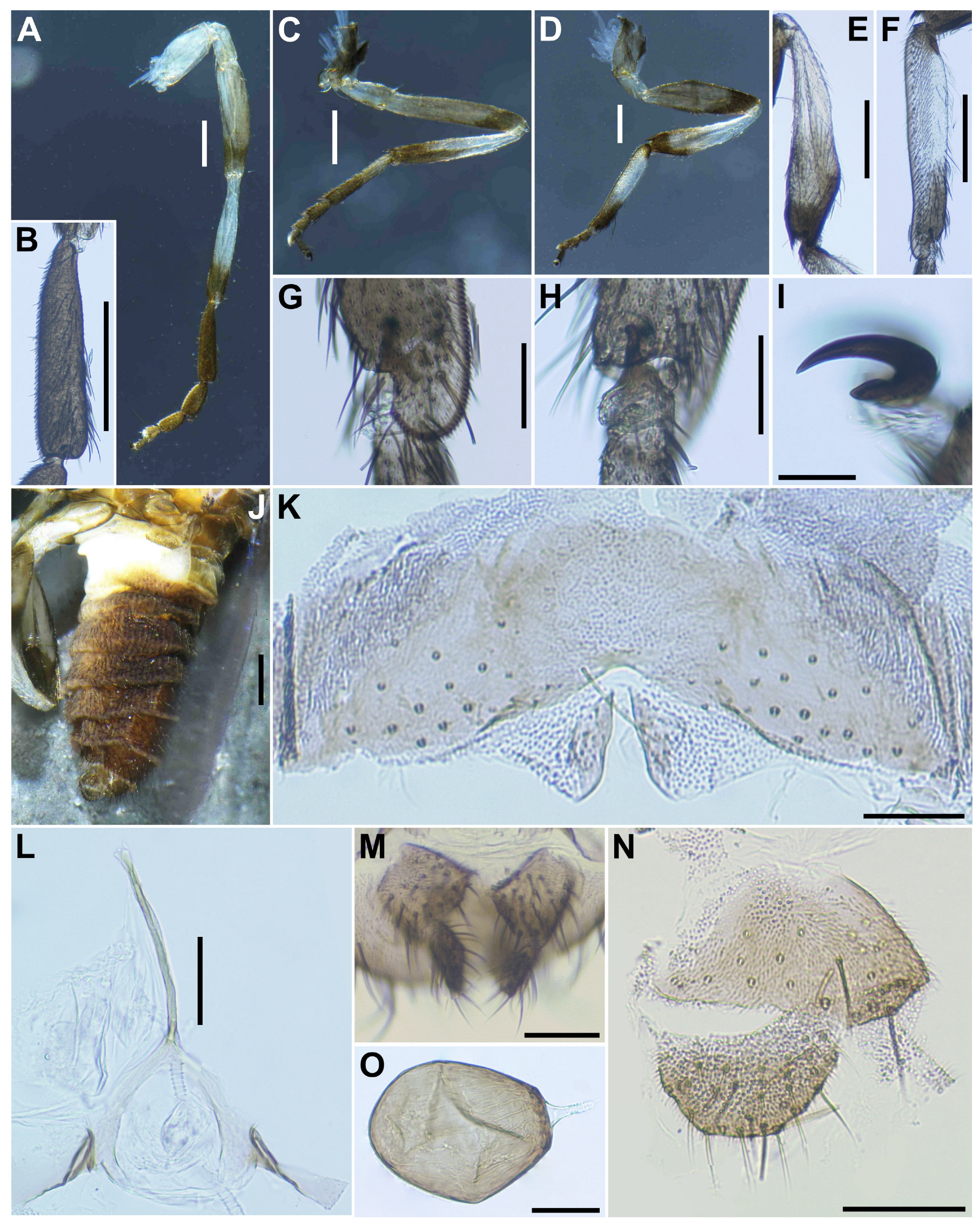 Legs. Foreleg (Figure 2A): coxa whitish yellow; trochanter light brown; femur light brown with apex medium brown (though extreme tip yellow); tibia white with distal 1/3 brownish black, outer surface largely white iridescent when illuminated; tarsus brownish black; basitarsus (Figure 2B) moderately dilated, 4.5 times as long as its greatest width. Midleg (Figure 2C): coxa medium brown except posterolateral surface dark brown; trochanter light brown; femur light to medium brown with apex medium to dark brown (though extreme tip yellow); tibia white on little more than basal half, and light to dark brown on rest; tarsus brownish black, except basal half of basitarsus light brown, though its border not well defined. Hind leg (Figure 2D): coxa light brown; trochanter whitish yellow; femur medium brown with base whitish yellow and apical cap dark brown; tibia (Figure 2E) whitish on basal half or little more, and light brown to brownish black on apical covered with whitish-yellow fine hairs on outer and posterior surfaces of basal three-fourths and white sheen on posterior surface of basal three-fourths when illuminated at certain angles; tarsus brownish black except basal two-thirds of basitarsus (though base light brown and narrow portion along anterior margin slightly darkened), and basal one-third of second tarsomere white; basitarsus (Figure 2F) narrow, nearly parallel-sided, 5.4 times as long as wide, and 0.6 and 0.5 times as wide as greatest widths of tibia and femur, respectively; calcipala (Figure 2G) nearly as long as wide at base, and 0.42 times as wide as greatest width of basitarsus. Pedisulcus (Figure 2H) well defined. Claw (Figure 2I) with large basal tooth 0.45 times length of claw. Wing. (n = 4). Length 1.9–2.1 mm (mean 2.0 mm). Costa with dark spinules and dark hairs. Subcosta with dark hairs except near apex bare. Base of radial vein with tuft of dark brown hairs. Basal portion of radius fully haired; R1 with dark spinules and hairs; R2 with hairs only. Basal cell absent. Halter. White except basal stem darkened. Abdomen (Figure 2J). Basal scale light brown, with fringe of whitish-yellow hairs. Dorsal surface of abdomen brownish black except segment 2 whitish brown, moderately covered with dark short to long hairs and yellow fine short hairs; tergites of segments 6–9 shiny when illuminated at certain angles; ventral surface of segment 2 whitish, and those of other segments medium to dark brown. Sternal plate on segment 7 undeveloped. Terminalia. Sternite 8 (Figure 2K) bare medially, with 12–17 medium-long to long hairs, together with 2 or 3 slender short hairs on each side. Ovipositor valves (Figure 2K) triangular, thin, membranous, each moderately covered with micro-setae interspersed with 1 or 2 short hairs; inner margins slightly sinuous, sclerotized, and somewhat separated from each other. Genital fork (Figure 2L) of usual inverted-Y form, with slender and thick stem; arms of moderate width and moderately folded medially, and lateral plate of each arm with thin lobe projection directed posteromedially. Paraproct in ventral view (Figure 2M) somewhat widened posteromedially, with 5 or 6 sensilla on anteromedial surface; paraproct in lateral view (Figure 2N) slightly produced ventrally, 0.42–0.44 times as long as wide, with 18–20 medium-long to long hairs on ventral and lateral surfaces. Cercus in lateral view (Figure 2N) short, rounded posteriorly, 0.54–0.56 times as long as wide. Spermatheca (Figure 2O) ellipsoidal, 1.5 times as long as its greatest width, dark brown except duct unpigmented, and with many fissures on surface; internal setae absent.