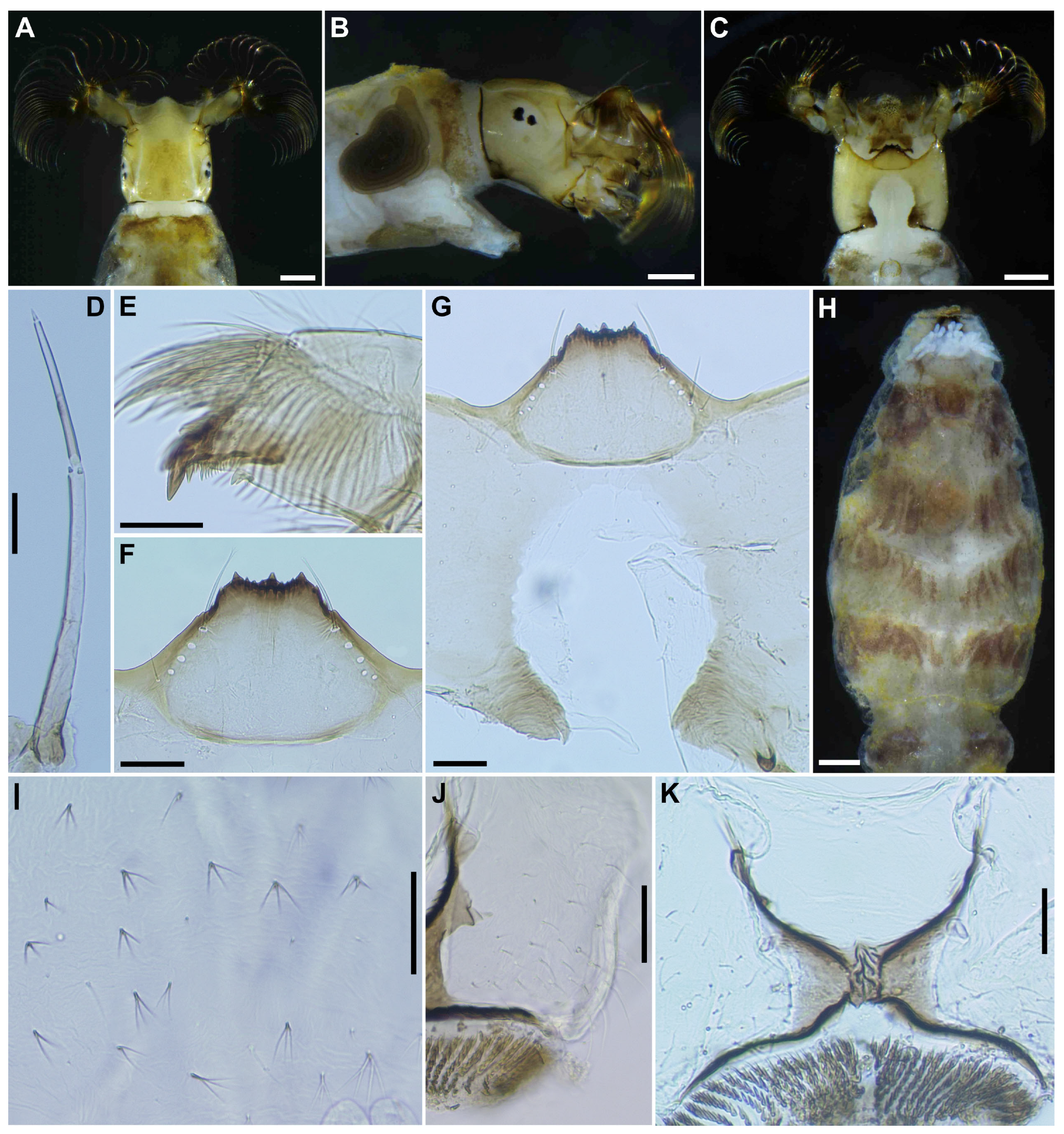 Female (n = 3). Body length 2.1–2.3 mm (mean 2.2 mm). Head (Figure 1A). Slightly narrower than width of thorax. Frons brownish black to black, moderately covered with yellowish white scale-like recumbent short hairs interspersed with several dark longer hairs along each lateral margin; frontal ratio 1.3–1.4:1.0:2.1–2.2; frons-head ratio 1.0:4.6–4.7. Fronto-ocular area well developed, narrow, directed dorsolaterally. Clypeus brownish black to black, shiny, silver pruinose, brilliantly iridescent when illuminated, densely covered with yellowish white short hairs interspersed with dark longer hair on each side. Labrum 0.6–0.7 times as long as clypeus. Antenna (Figure 1A,B) composed of scape, pedicel, and 9 flagellomeres, brownish black except scape, pedicel, and anterior surface of first and second flagellomere yellow, first flagellomere 1.7–1.8 times as long as second. Maxillary palpus composed of 5 segments, medium brown, proportional lengths of third, fourth, and fifth segments 1.0:1.0–1.1:2.7–2.8; third segment (Figure 1C) swollen; sensory vesicle (Figure 1D) elongate, 0.65 times as long as third segment, with medium-sized opening. Maxillary lacinia (Figure 1E) with 8 inner and 11 outer teeth. Mandible (Figure 1F) with 17 or 18 inner and 8 or 9 outer teeth. Cibarium (Figure 1G) medially forming sclerotized plate folded forward from posterior margin, with dark mediolongitudinal ridge having bifid apex. Thorax. Scutum (Figure 1H–K) brownish black to black except anterolateral calli light brown, whitish-pruinose and shiny when illuminated at certain angles, with 3 longitudinal vitae (1 narrow median and 2 broad submedian), densely covered with whitish scale-like recumbent short hairs sparsely intermixed with brown similar short hairs mainly on longitudinal vittae (Figure 1I). Scutellum (Figure 1J) dark brown, shiny when illuminated at certain angles, covered with dark brown long hairs. Postnotum (Figure 1J) dark brown, gray-pruinose, shiny when illuminated at certain angles, and bare. Pleural membrane (Figure 1K) whitish yellow and bare. Katepisternum dark brown, longer than deep, shiny when illuminated at certain angles, and moderately covered with dark brown hairs.