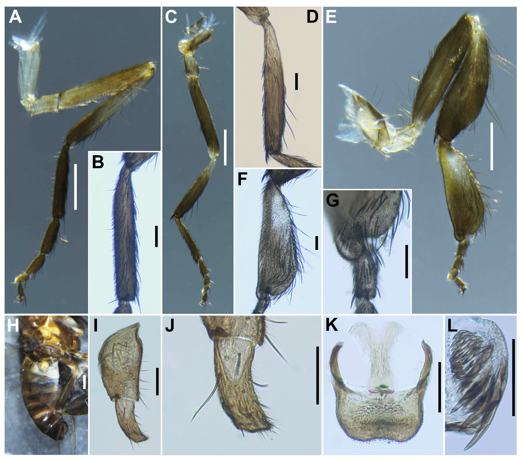Figure 12. Male of S. trangense. (A) Foreleg; (B) Fore basitarsus; (C) Midleg; (D) Mid tibia; (E) Hind leg; (F) Hind basitarsus; (G) Calcipala, right side, inner view; (H) Abdomen, lateral view; (I) Coxite and style, ventral view; (J) Style, ventrolateral view; (K) Ventral plate and median sclerite, ventral view; (L) Paramere. Scale bars: 0.2 mm for (A,C,E,H) and 0.05 mm for (B,D,F,G,IL).