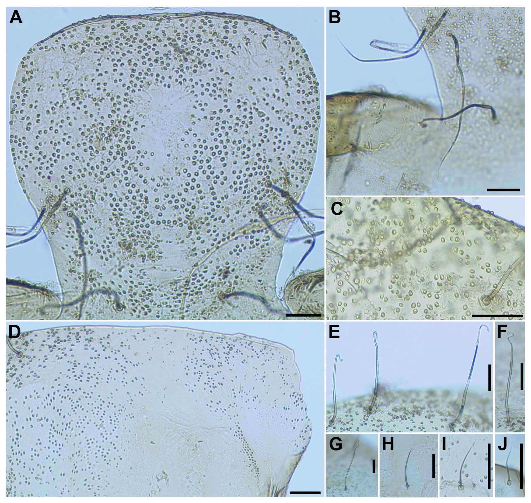Figure 13. Pupa of S. trangense. (A) Frons and tubercles on frons; (B) Frontal trichomes and facial trichome; (C,D) Tubercles on thoracic integument of anterior (C) and posterior half (D) portions; (EJ) Thoracic trichomes on anterodorsal (E), anterolateral (F,G), mediolateral (H), and ventrolateral (I,J) surfaces. Two types of trichomes are present on anterolateral surface including coiled (F) and uncoiled (G) trichomes. Scale bars: 0.05 mm.