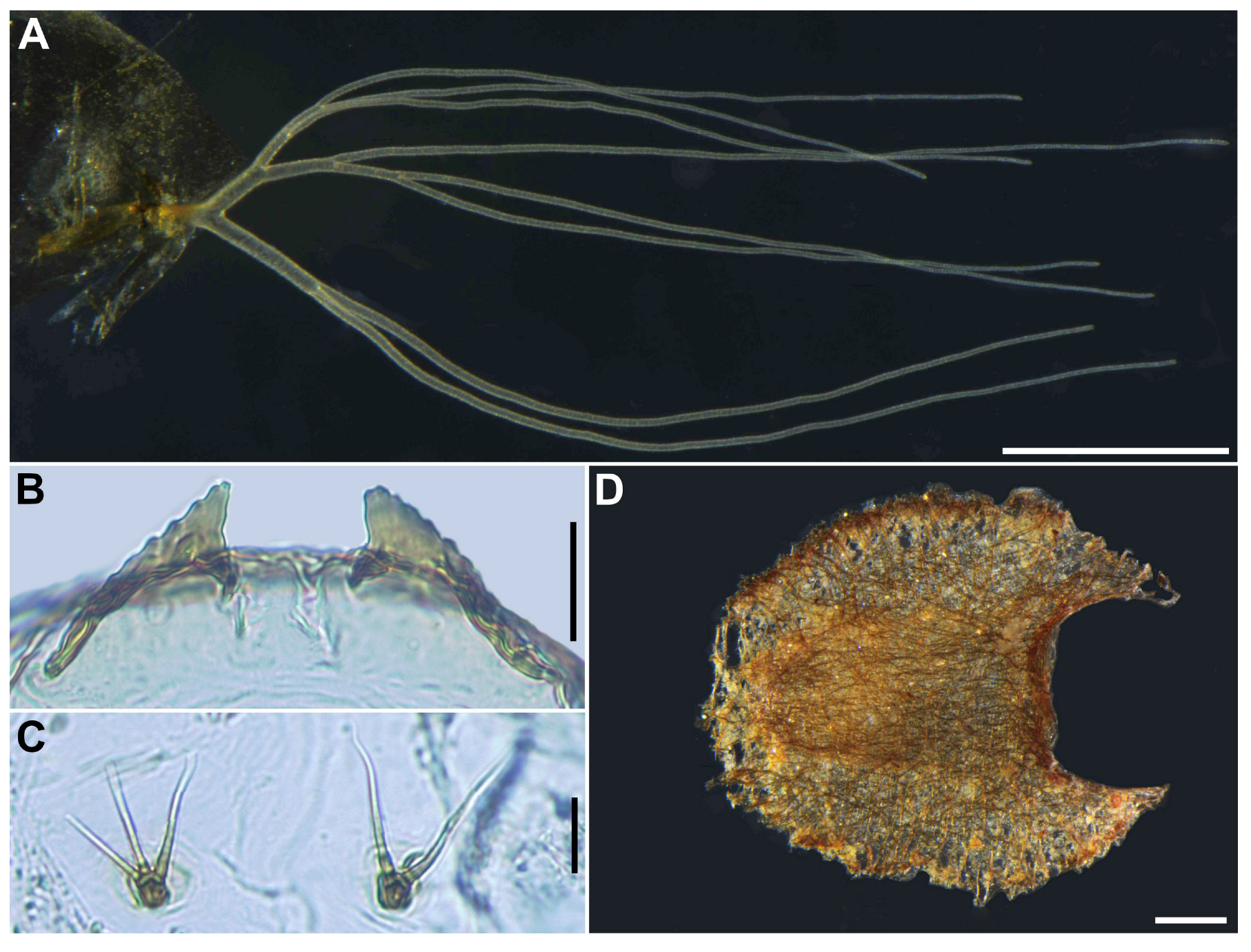 Figure 14. Pupa of S. trangense. (A) Gill filaments; (B) Terminal hooks, caudal view; (C) Bifid and trifid hooks on ventral surface of abdominal segment 5; (D) Cocoon, dorsal view. Scale bars: 0.5 mm for (A,D) and 0.02 mm for (B,C).
