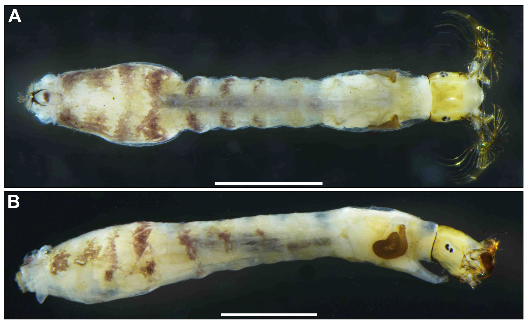 The new species is distinguished from S. doisaketense Jitklang, Kuvangkadilok, Baimai, Takaoka & Adler, 2008, reported from northern Thailand by Jitklang et al. [7], in the larval stage by the presence of reddish-brown transverse bands on abdominal segments 2–4 (cf. S. doisaketense has greenish transverse bands on abdominal segments 1–4), and a deep postgenal cleft that is 13–15 times as long as the postgenal bridge (cf. S. doisaketense has a medium-long postgenal cleft (1.5–2.8 times as long as postgenal bridge)).