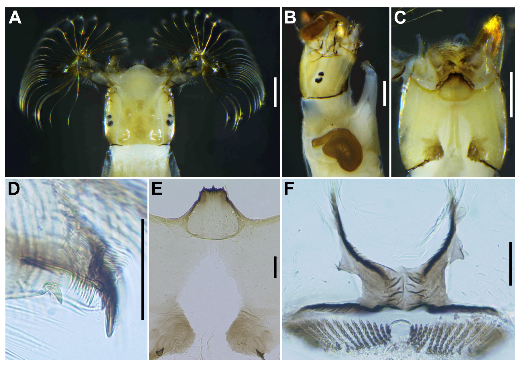 Figure 16. Larva of S. trangense. (AC) Head capsules, dorsal (A), lateral (B), and ventral (C) view; (D) Mandible; (E) Postgenal cleft; (F) Anal sclerite, dorsal view. Scale bars: 0.2 mm for (AC) and 0.05 mm for (DF).