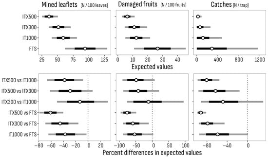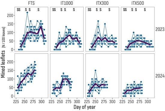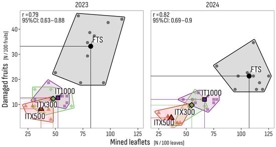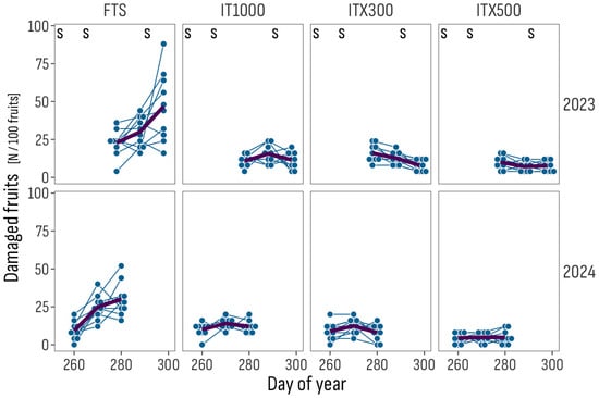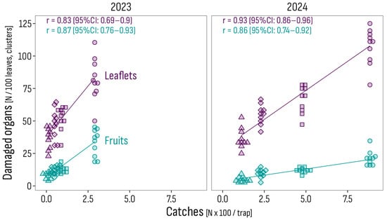3.2. Incidence of Mined Leaflets and Damaged Fruits