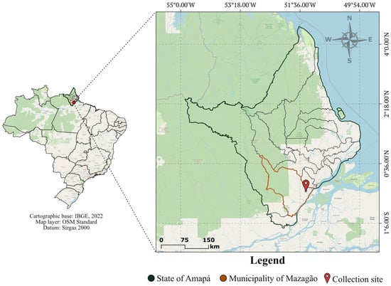 Location map of the municipality of Mazagão, showing the mosquito sampling site. This figure was created using QGIS v.3.22 (https://qgis.org/en/site/, accessed on 5 August 2025), based on cartographic data from the Brazilian Institute of Geography and Statistics (IBGE, 2022; https://www.ibge.gov.br/, accessed on 5 August 2025) and raster layers from the OpenStreetMap project (https://www.openstreetmap.org/#map=4/-14.39/-57.39, accessed on 5 August 2025). On the left, the map of Brazil is shown; the right panel highlights the state of Amapá (in green), the municipality of Mazagão (in orange), and the sampling site (marked in red).