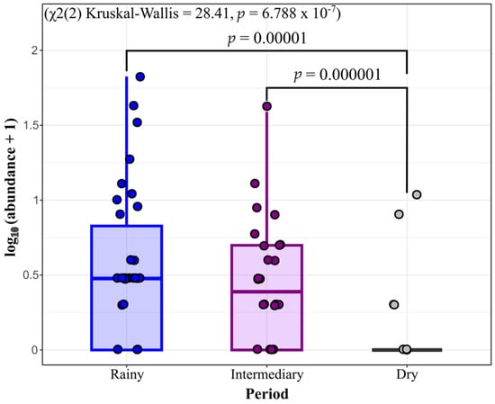 The variance analysis (χ2(2) = 28.41, p = 6.79 × 10−7) revealed significant differences in diversity among the collection periods. Dunn’s post hoc test showed highly significant differences between the intermediary and dry periods (p = 0.00001) and between the rainy and dry periods (p = 0.000001). In contrast, no significant difference was observed between the rainy and intermediary periods (p = 1.000) (Figure 2).