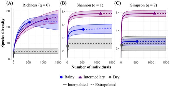 Sample effort curves for (A) species richness (q = 0), (B) Shannon diversity (q = 1), and (C) Simpson index (q = 2) during the rainy (blue, April 2024), intermediary (purple, July 2023), and dry (gray, November 2023) periods in Mazagão Velho, Brazil. The curves depict the increase in expected richness and effective diversity as a function of sampling effort, demonstrating seasonal variations in mosquito community composition.