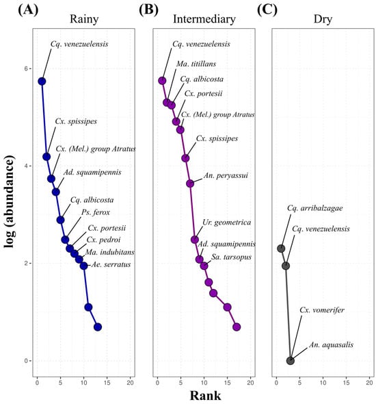 The rank-abundance curves indicated seasonal variations in mosquito community composition (Figure 4). During the intermediary period, the highest diversity and balance in abundance distribution were recorded, with Cq. venezuelensis and Ma. titillans as the most abundant species, accompanied by others with intermediary occurrence. In the rainy period, diversity was moderate, with dominance of Cq. venezuelensis and Cx. spissipes, followed by a sharp decline in the abundances of other species. In the dry period, the community was less diverse, with a strong predominance of Cq. arribalzagae and Cq. venezuelensis and overall reduced abundance, evidencing the impact of adverse environmental conditions on species richness and distribution.