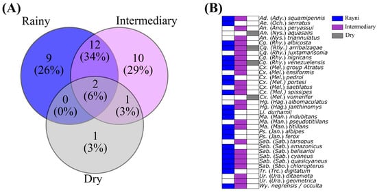 Venn diagram compiling the distribution of species richness (A) and overlap of mosquito species across the rainy (blue, April 2024), intermediary (purple, July 2023), and dry (gray, November 2023) periods in Mazagão Velho, Brazil (B).