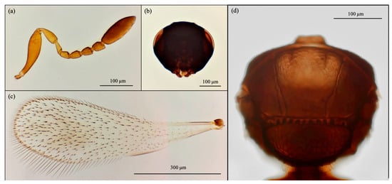 Amitus spiniferus: female. (a) antenna; (b) head; (c) forewing; (d) thorax.