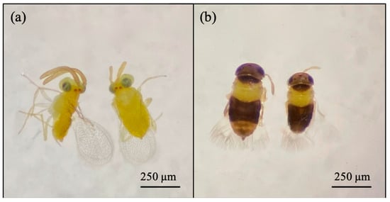 (a) Eretmocerus paulistus female (right) and male (left); (b) Signiphora xanthographa female (left) and male (right).