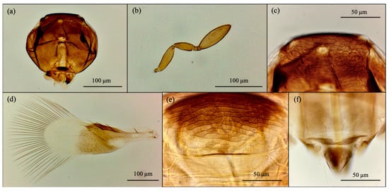 - Noyes, J.S. Collecting and preserving chalcid wasps (Hymenoptera: Chalcidoidea). J. Nat. Hist. 1982, 16, 315–334. [Google Scholar] [CrossRef]