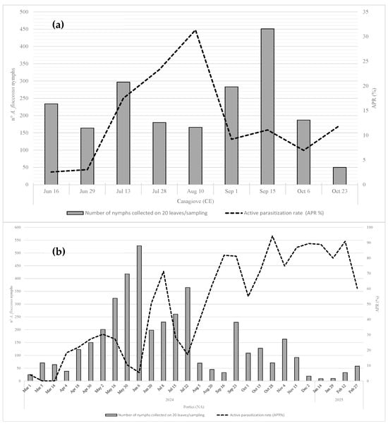 Population dynamics of A. floccosus and the active parasitization rate during 2024–2025: (a) Casagiove site; (b) Portici site.
