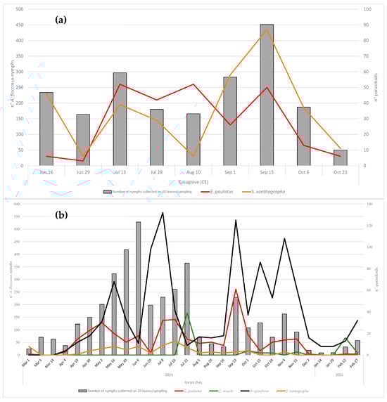 Population dynamics of A. floccosus and its parasitoids during 2024–2025: (a) Casagiove site; (b) Portici site.