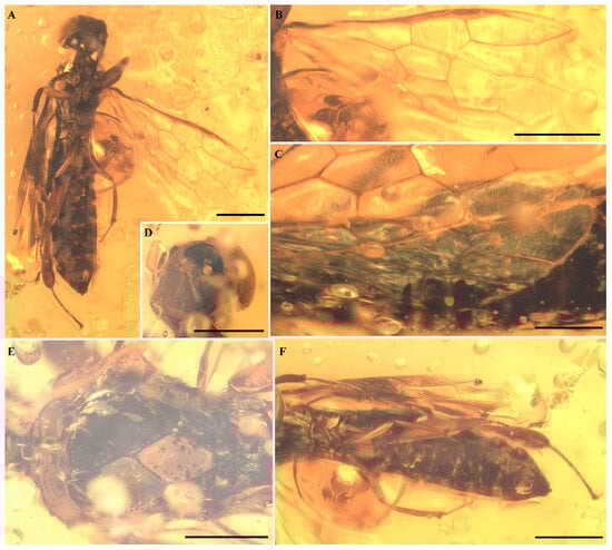 - Oyama, N.; Jouault, C.; Mita, T. Discovery of a New Anaxyelid Wasp (Hymenoptera: Anaxyelidae) in Mid-Cretaceous Kachin Amber. Palaeoentomology 2025, 8, 89–95. [Google Scholar] [CrossRef]