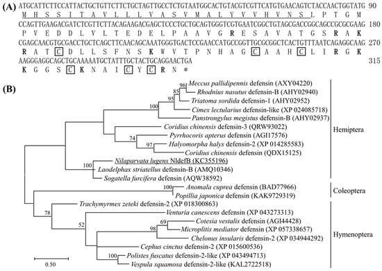 Structural and phylogenetic analysis of NldefB. (A) The cDNA and amino acid sequences of NldefB. Signal peptide sequence is underlined; The cationic amino acid residue is shown in bold and the conserved cysteine site is marked with a box; Asterisk indicates termination codon. (B) Phylogenetic tree of NldefB and defensins from other insects by maximum likelihood tree based on amino acid sequences. NldefB is underlined; The numbers at each branch point represents the percentage of the bootstrap values. Bootstrap values smaller than 50 are hidden. GenBank accession number for each insect defensin is parenthesized.