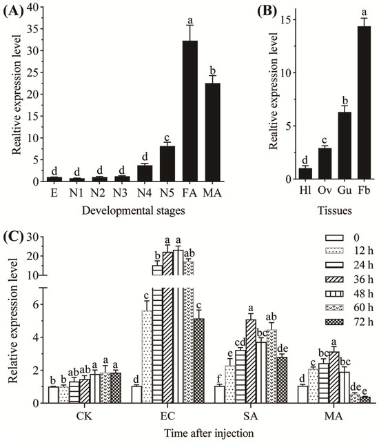 Analysis of expression pattern of NldefB in BPH. (A) Expression level of NldefB across different developmental stages of BPH. E: eggs (n = 100); N1-N5: first- to fifth-instar nymphs (n = 20); FA: female adults (n = 10); MA: male adults (n = 10). (B) Expression level of NldefB at different tissues of BPH. Hl: hemolymph; Ov: ovary; Gu: gut; Fb: fat body. A total of 100 newly emerged female adults were dissected as a replicate. (C) Expression level of NldefB at 0, 12, 24, 36, 48, 60 and 72 h after injection with different microbes in the fifth-instar nymphs of BPH (n = 100). CK: Control group; EC: Escherichia coli-treated group; SA: Staphylococcus aureus-treated group; MA: Metarhizium anisopliae-treated group. Each treatment contained three biological replicates. Different letters above bars indicate significant difference (p < 0.05, one-way ANOVA test).