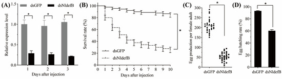 Effect of NldefB silencing on the BPH survival and reproduction. (A) Relative expression level of NldefB after dsNldefB injection. Each treatment had three biological replicates, and each replicate contained 20 newly emerged BPH adults. (B) The survival rates of newly emerged BPH adults during a ten-day period in the dsNldefB-injected group and the dsGFP-injected control group. Each treatment consisted of three replicates, with 50 adults per replicate. The survival analysis was performed using Kaplan–Meier plots (p < 0.05, log-rank chi-squared test). (C,D) The effect of NldefB silencing on the egg production and egg hatching rate. Each treatment contained 30 biological replicates, and each pair of adults was considered as one replicate. Asterisk (*) indicates significant difference determined between the dsNldefB-injected group and the dsGFP-injected control group (p < 0.05, t-test).