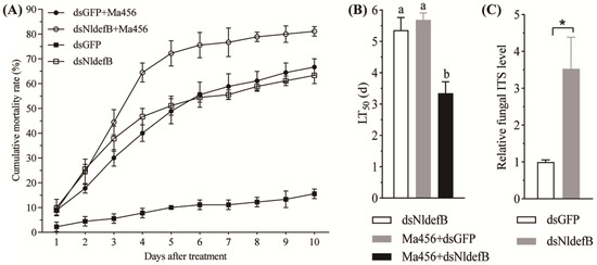 Effect of NldefB silencing on the BPH resistance to fungal infection. (A) Trends of cumulative mortality rates of BPH after combined treatment with NldefB silencing and M. anisopliae infection. The newly emerged adults were pre-injected with dsNldefB or dsGFP and then immediately sprayed with 1 mL of Ma456 conidial suspension (1 × 108 conidia/mL), respectively. Each treatment consisted of three replicates, with 50 adults per replicate. (B) LT50 values of BPH after combined treatment with NldefB silencing and M. anisopliae infection. The values of LT50 for all bioassays were estimated using non-linear regression data analysis programs and the statistical model of log (agonist) vs. normalized response (variable slope) was used for the parameter generation. Different letters above bars indicate significant difference (p < 0.05, one-way ANOVA test). (C) The relative load of fungal hyphal bodies in the hemolymph of dsRNA-injected BPH nymphs at four days post-infection with M. anisopliae. The load of fungal hyphal bodies in the hemolymph was quantified by qPCR using the specific ITS primers of M. anisopliae. The 18S rDNA of BPH was used as an internal reference. The relative load in the hemolymph of adults co-treated with dsNldefB injection and Ma456 infection was calculated in comparison to the dsGFP+Ma456 co-treated control. Each treatment contained three biological replicates, and a total of 100 adults were dissected as a replicate. The asterisk (*) indicates significant difference (p < 0.05, t-test).