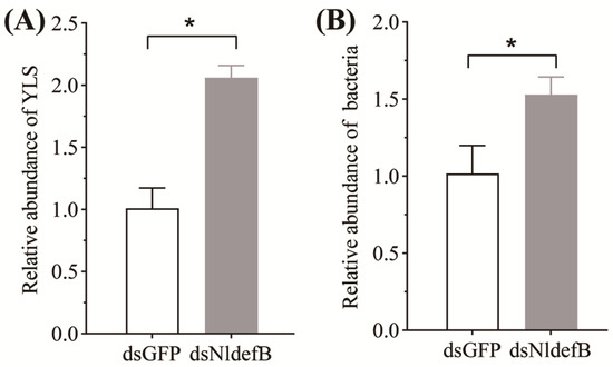 The effect of NldefB silencing on the load of yeast-like symbiotes (YLS) (A) and bacteria (B) in the body cavity of BPH. The asterisk (*) above bars indicates significant difference (p < 0.05, t-test). The abundance of YLS and bacteria were assessed by qPCR with YLS-specific primers and universal bacterial 16S rRNA primers, respectively. The 18S rDNA of BPH was used as an internal reference. The relative abundance in the dsNldefB-injected adults was calculated in comparison to the dsGFP-injected control. Each treatment consisted of three replicates, with 50 adults per replicate.