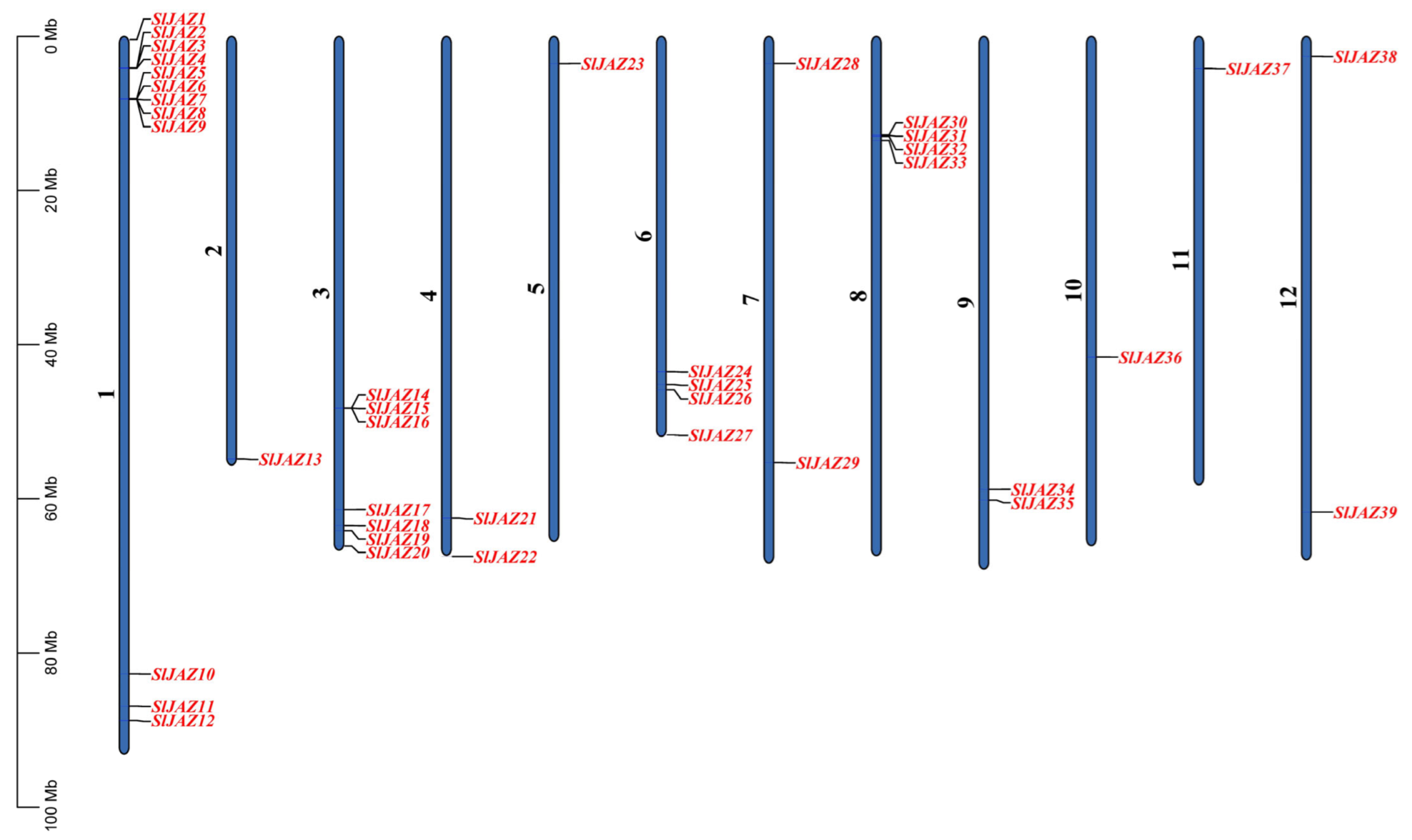Figure 1. Chromosomal distribution of JAZ genes in S. lycopersicum. This figure shows the mapping of 39 identified JAZ genes across the 12 chromosomes of the tomato genome.