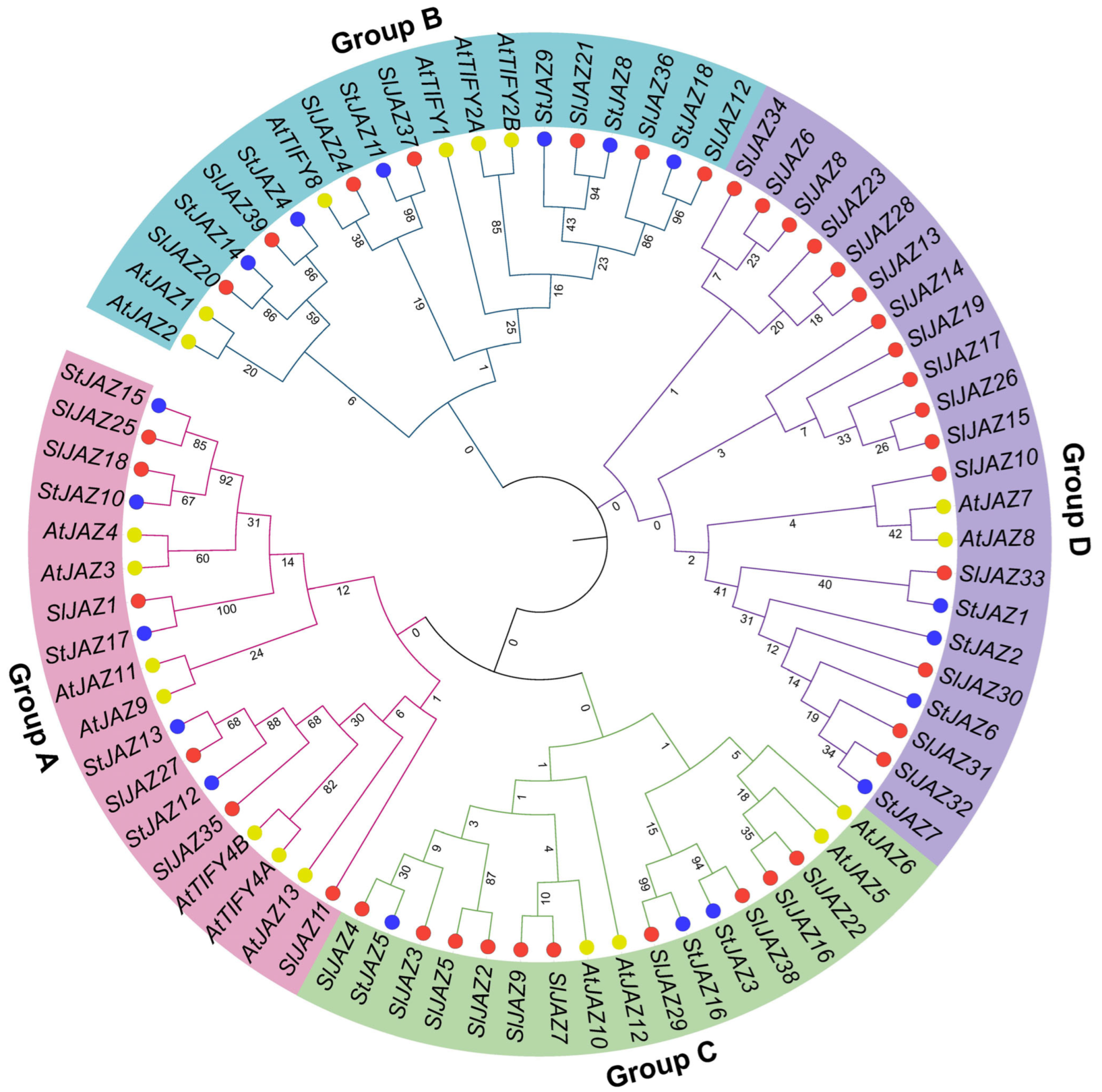 Figure 2. Phylogenetic relationships of JAZ proteins from Solanum lycopersicum (SlJAZ), Arabidopsis thaliana (AtJAZ), and Solanum tuberosum (StJAZ). The tree was constructed using the maximum likelihood method with 1000 bootstrap replicates and classified the 39 SlJAZ proteins into four major groups (A–D). Homologous proteins from A. thaliana and S. tuberosum were included for comparative analysis. Distinct background shading indicates the four groups, while node colors represent species origin: red = S. lycopersicum, blue = S. tuberosum, and yellow-green = A. thaliana. Grouping patterns supported by high bootstrap values highlight conserved evolutionary relationships, species-specific expansions, and functional conservation within the JAZ family.