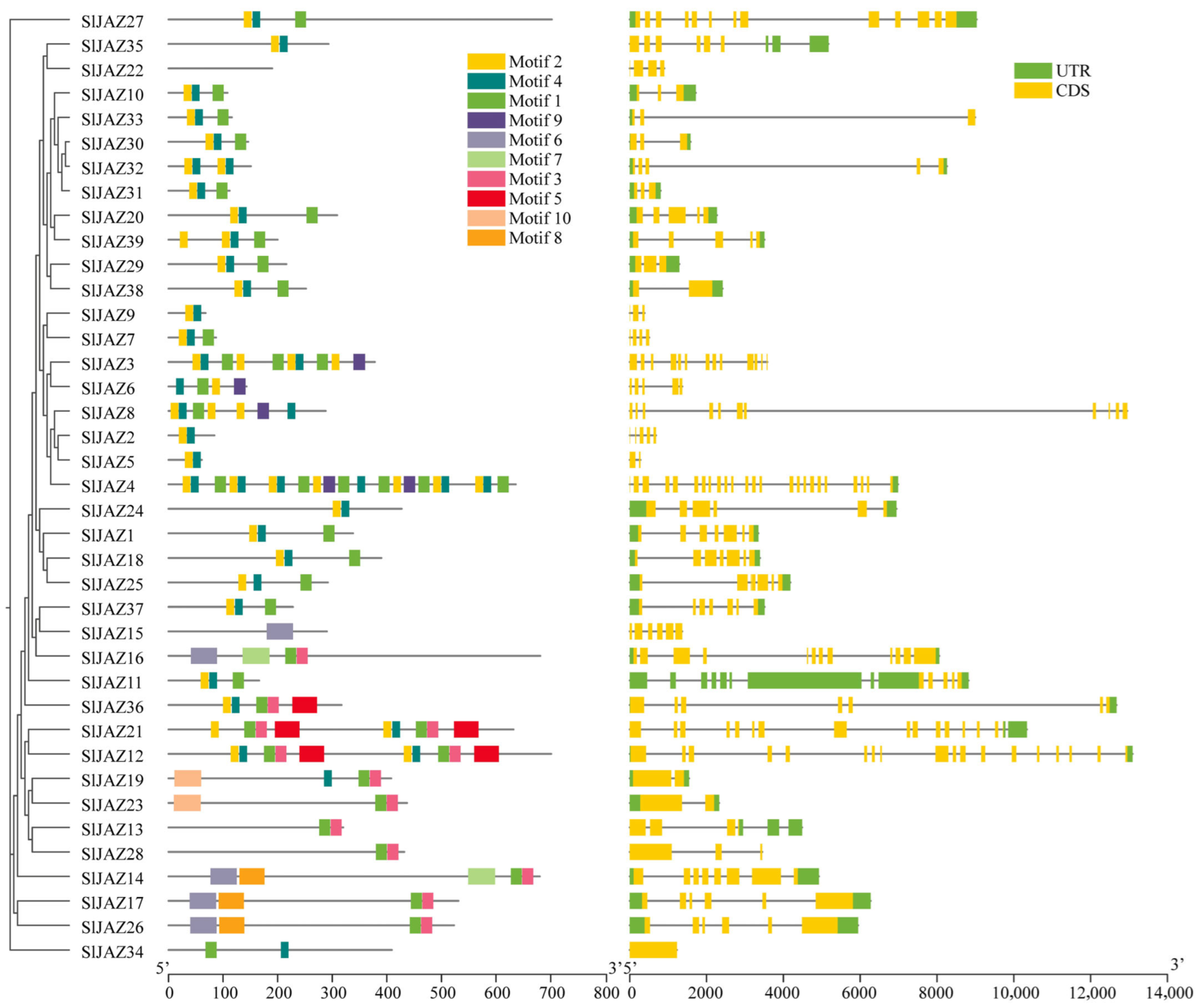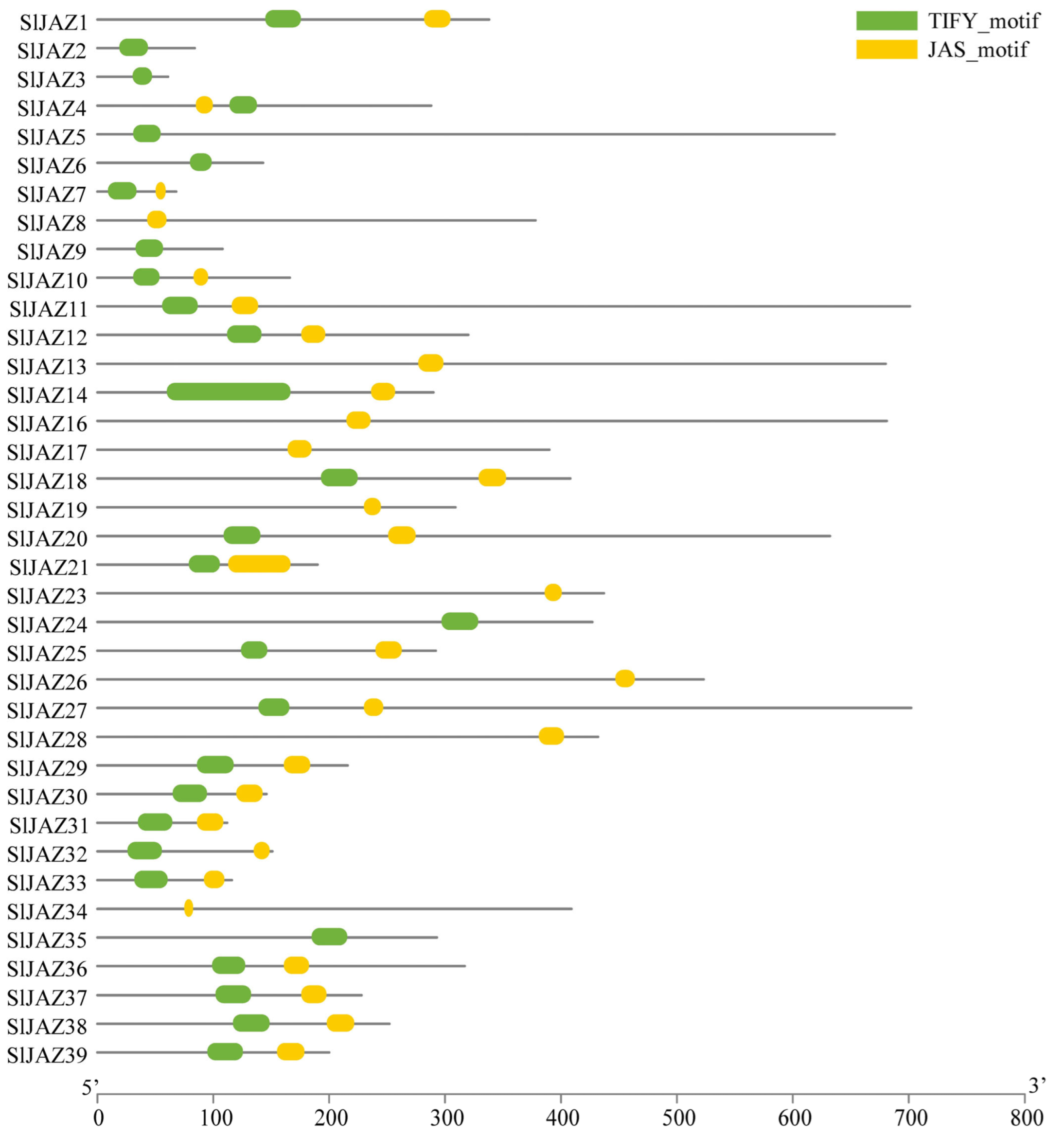 Figure 4. Gene structure and conserved domains of JAZ genes in S. lycopersicum. This figure displays the exon-intron organization and conserved domains (TIFY and JAS) within the 39 JAZ genes. Variability in gene structures, with differences in the number and length of exons and introns, suggests functional diversity among JAZ genes. The presence of the conserved TIFY domain (green) across all genes and the JAS domain (yellow) in most genes highlights their essential roles in jasmonate-mediated signaling and protein interactions.