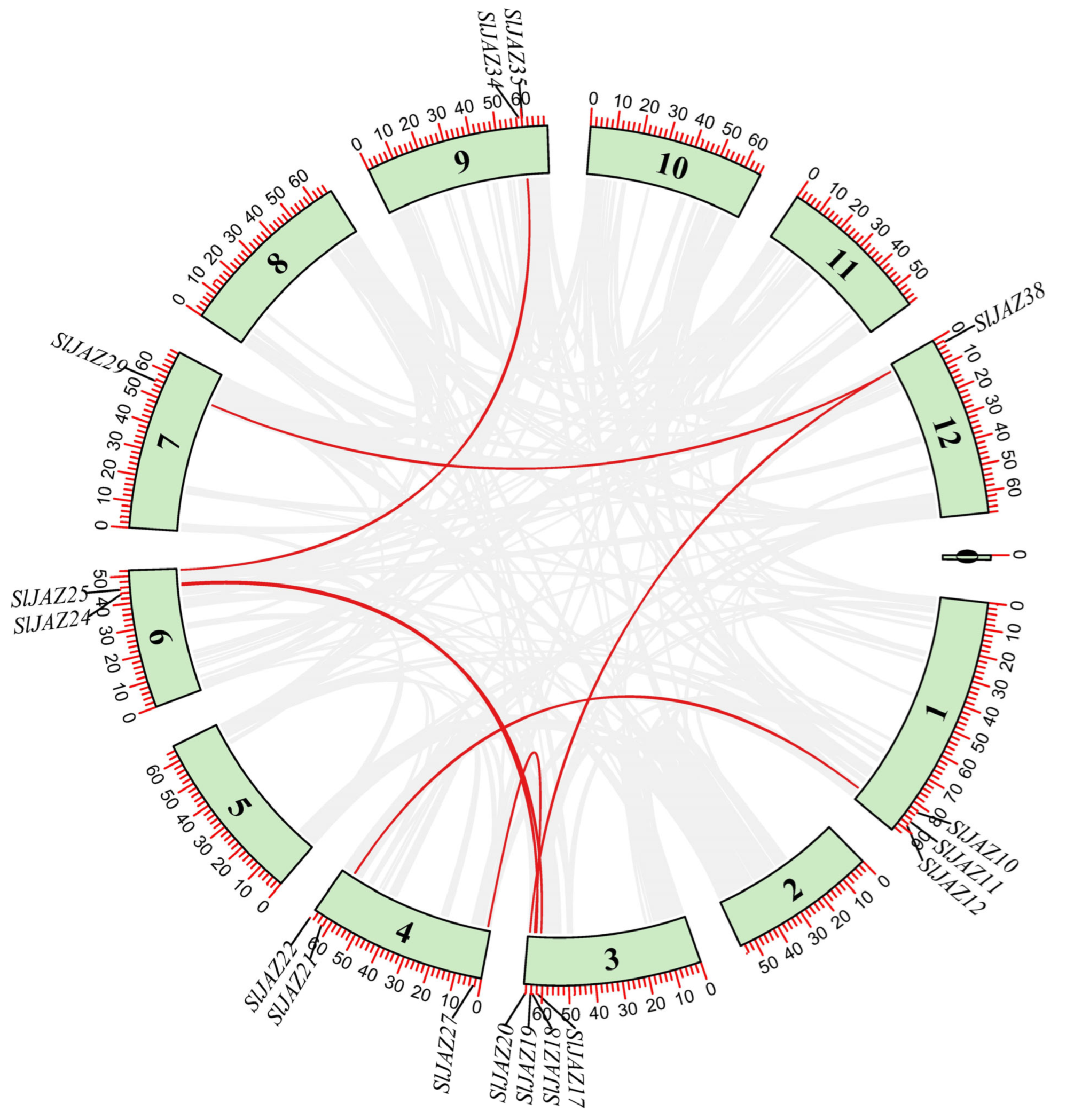 Figure 6. Chromosomal location and duplication events of JAZ genes in S. lycopersicum. SlJAZ genes predominantly shows segmental duplication.