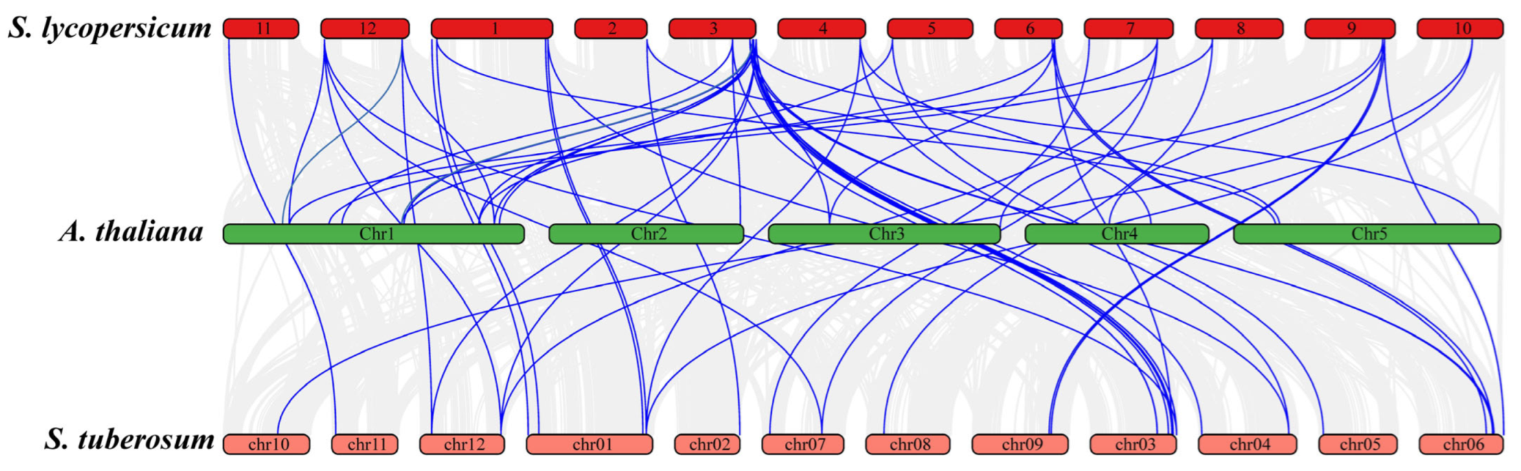 Comparative synteny analysis was conducted to investigate genome conservation between S. lycopersicum, S. tuberosum, and Arabidopsis, highlighting evolutionary relationships. The genome and GFF3 files were subjected to McScanX in TBtools software, and the resulting files were used for multiple synteny analysis. Homologous gene pairs were identified using MCScanX software (version 2.0), and collinear blocks were visualized to assess syntenic regions across species. Gene pairs involved in segmental or tandem duplications were highlighted to facilitate identification of duplication patterns.