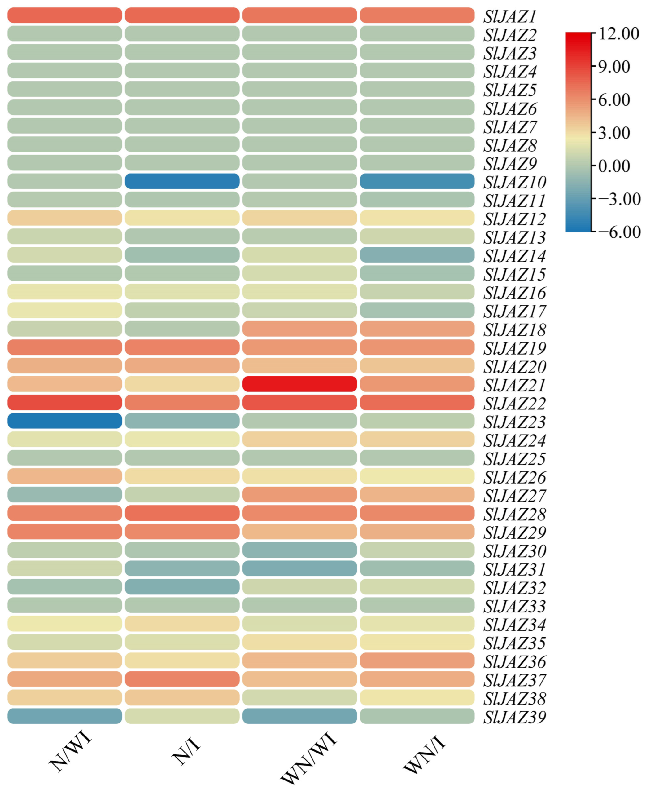 Figure 9. Expression profiling of selected SlJAZ genes under different treatments. Heatmaps represent relative expression patterns across the four treatment groups: WN/WI (without MSNs, without infestation), WN/I (without MSNs, with infestation), N/WI (with MSNs, without infestation), and N/I (with MSNs, with infestation). Expression values were log2-transformed and normalized, with red indicating upregulation and blue indicating downregulation.