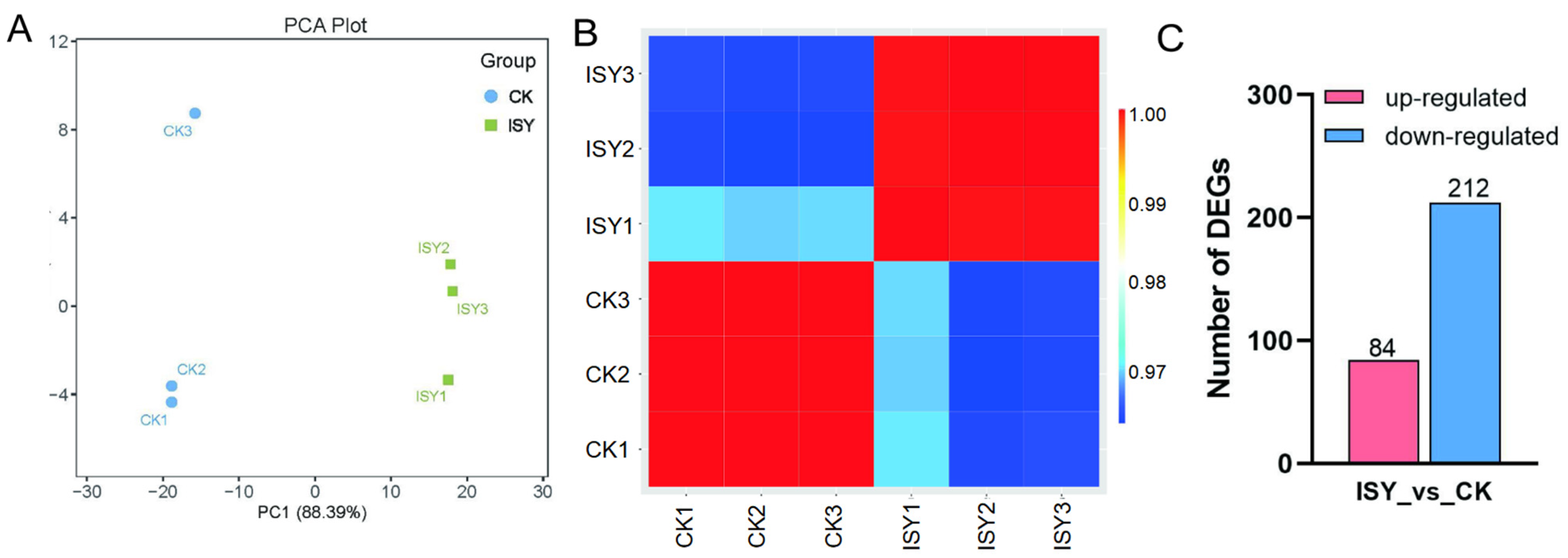 Figure 1. Transcriptomic alterations in A. cerana workers in the presence of V. velutina. (A) Principal component analysis (PCA) of the samples. (B) Heatmap of correlation between ISY and CK groups. The false color scale is displayed on the right side of the image. (C) Number of differentially expressed genes (DEGs) between the ISY and CK groups.
