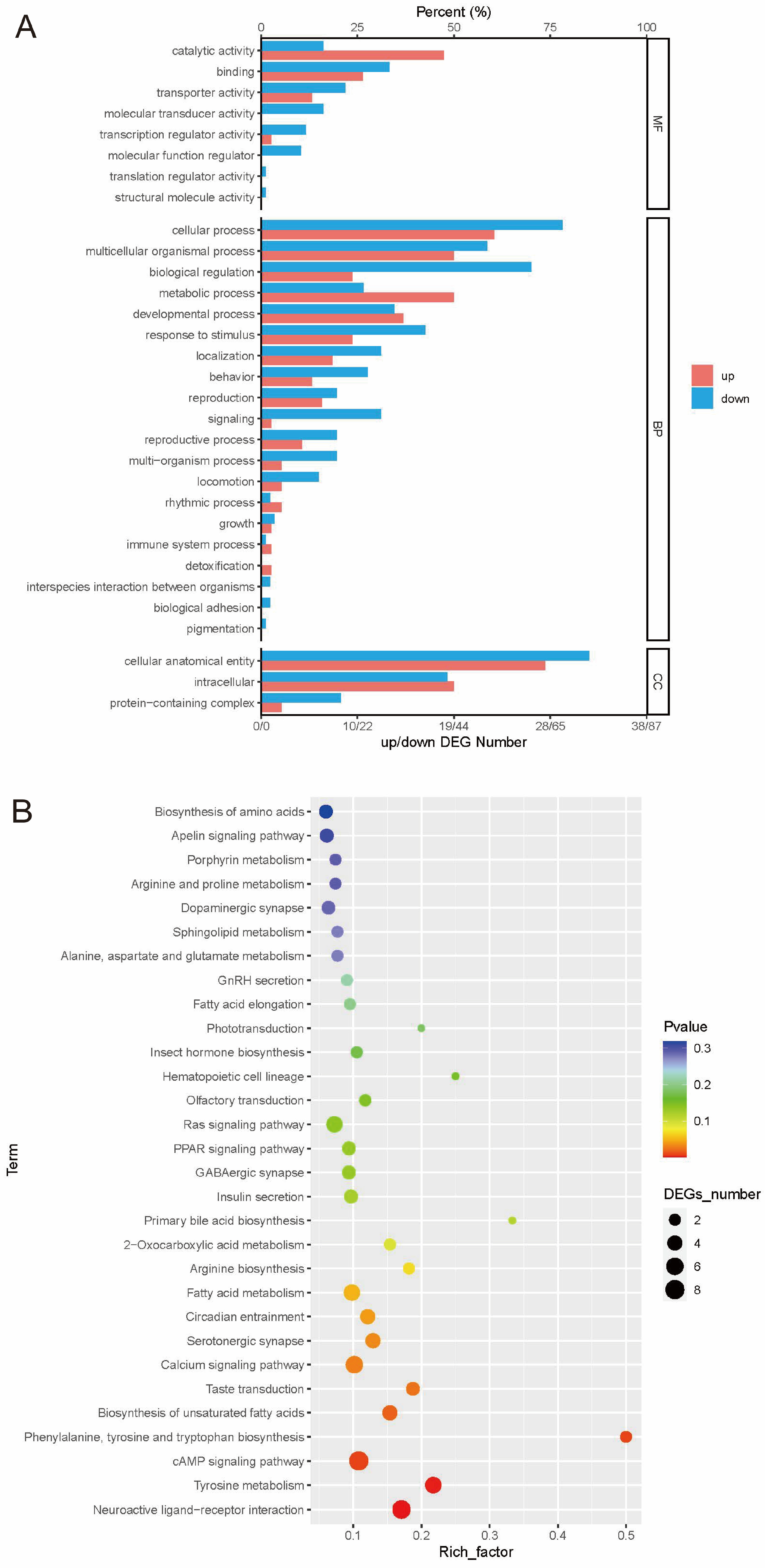 Figure 2. Enrichment analysis of differentially expressed genes (DEGs) in ISY and CK groups. (A) GO enrichment analysis. (B) KEGG pathway enrichment analysis.