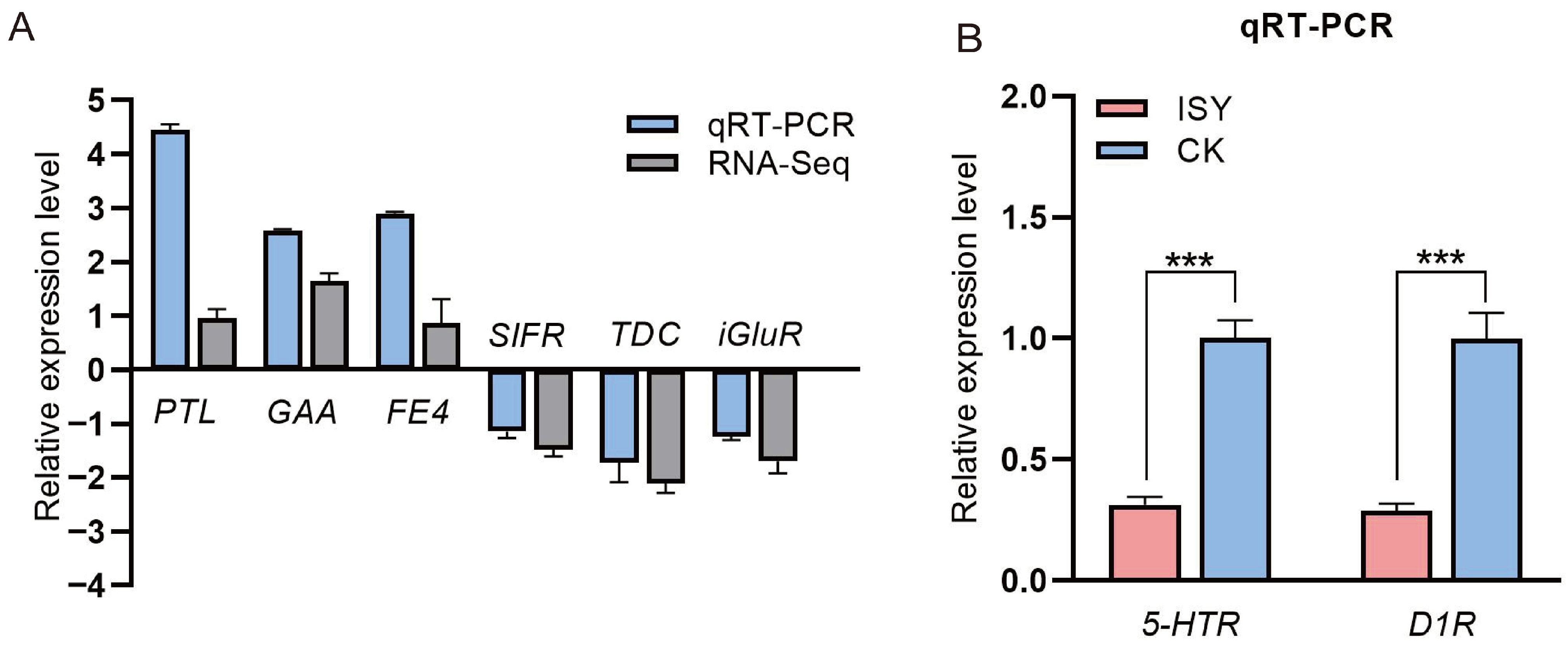 To validate the RNA-Seq results, we performed qRT-PCR on a subset of differentially expressed genes (DEGs), including the upregulated genes PTL, GAA, and FE4, and the downregulated genes SIFR, TDA, and iGluR. These genes were consistent with the expression pattern observed in the transcriptomic analysis, which confirmed the reliability of the transcriptome data (Figure 3A). Moreover, we found that the expression levels of candidate genes related to biogenic amines, including the 5-hydroxytryptamine receptor (5-HTR) gene and the dopamine receptor 1 (D1R) gene, were markedly reduced in the ISY group compared to the CK group (Figure 3B).