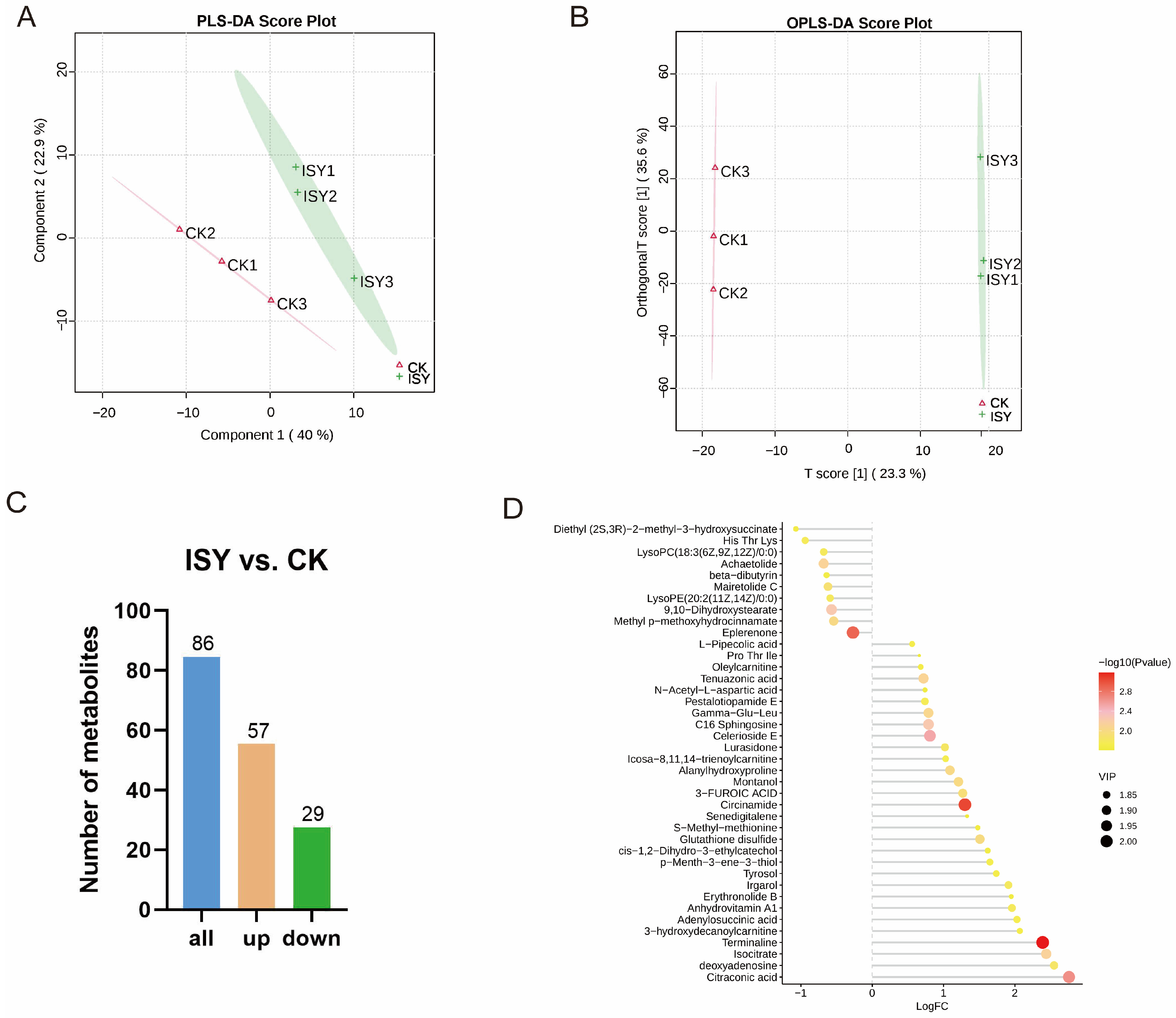Figure 4. Changes in metabolites in ISY and CK groups. (A) Analysis of differentially expressed metabolites (DEMs) based on PLS-DA scores. (B) OPLS-DA analysis. (C) Different metabolite counts. Yellow and green, respectively, indicate significantly upregulated and downregulated metabolites. (D) Top 30 DEMs between comparison groups.