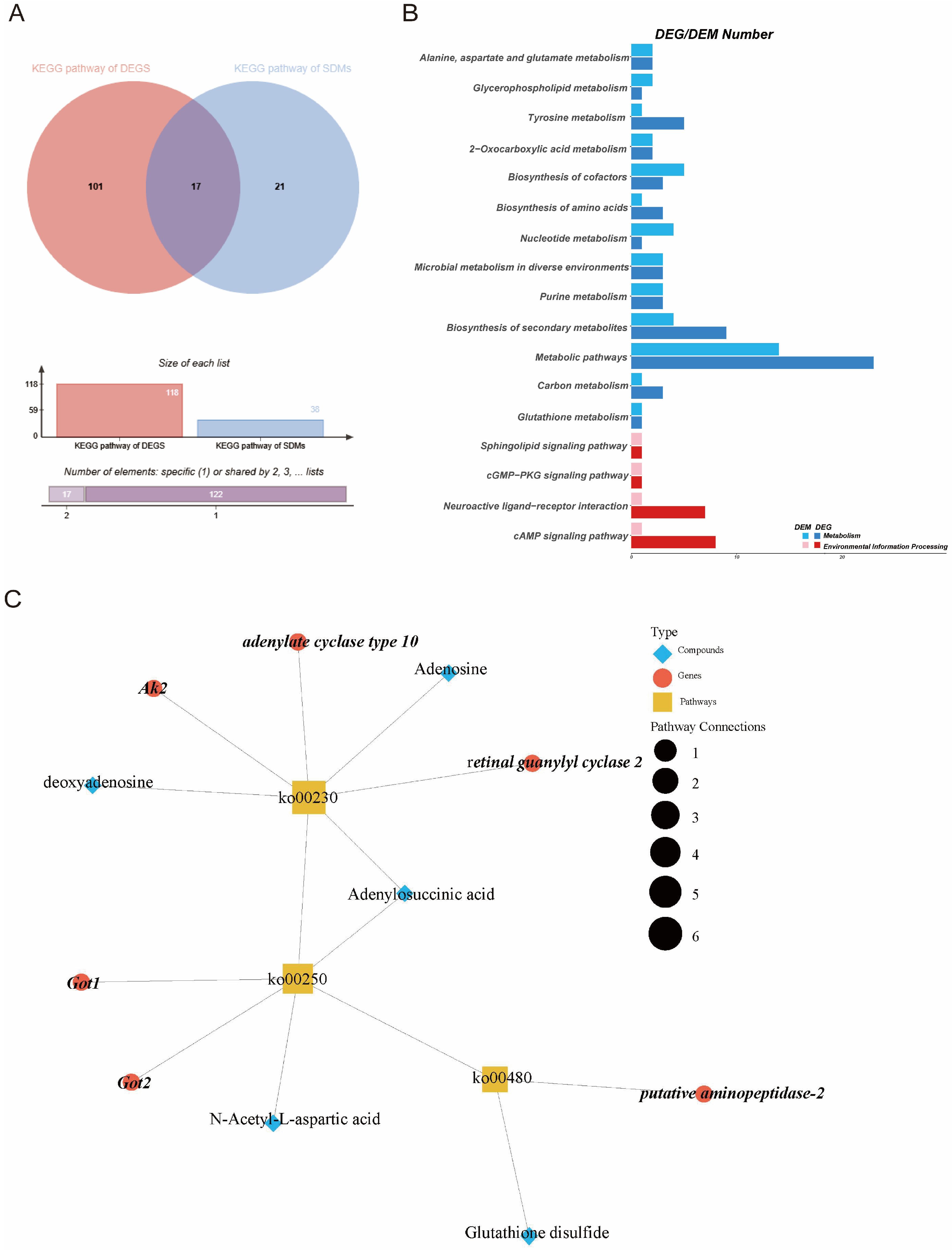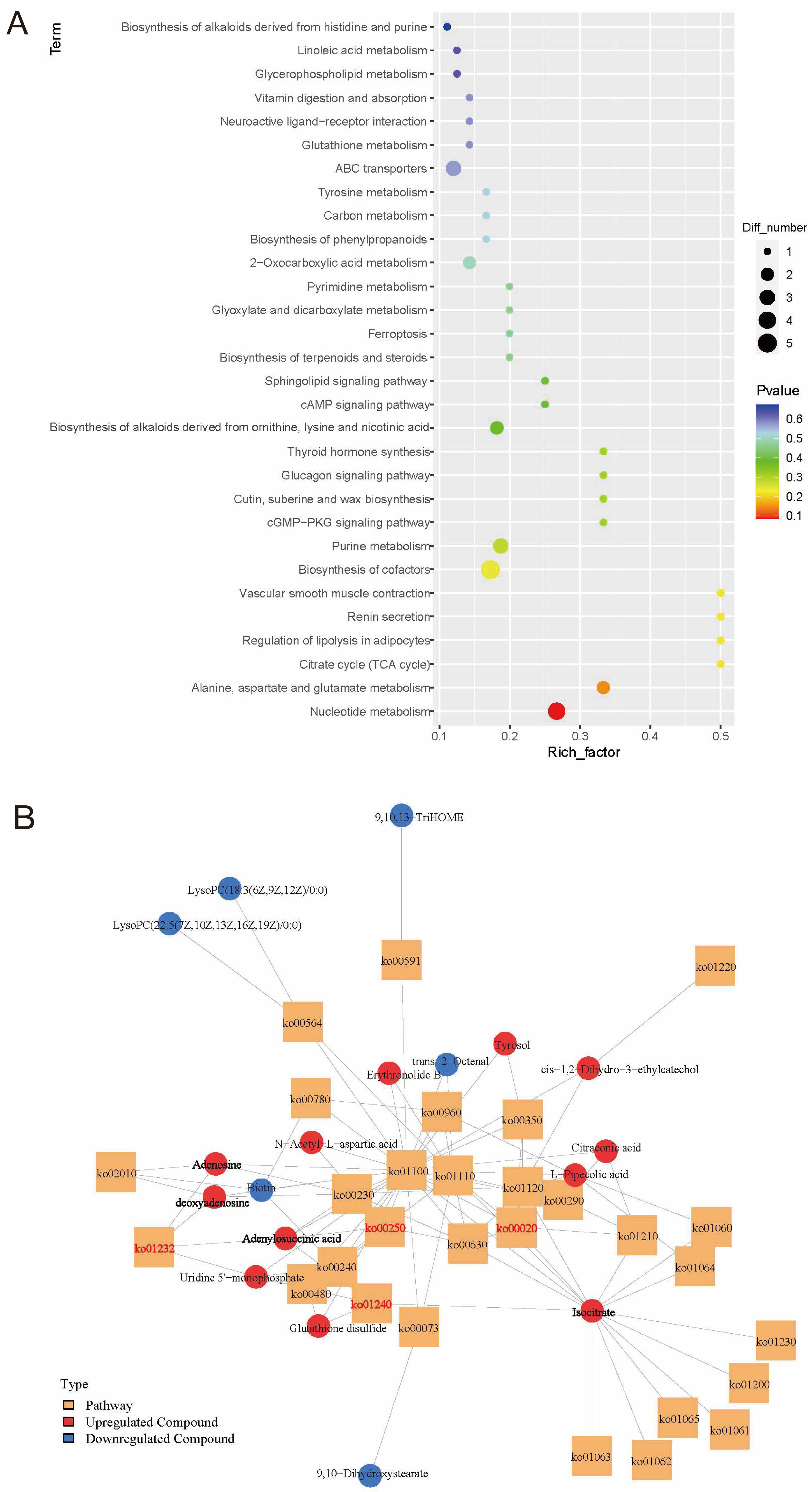 The KEGG analysis of DEGs and DEMs showed that there were 17 co-enriched KEGG pathways, mainly metabolic pathways (ko01100), tyrosine metabolism (ko00350), and purine metabolism (ko00230) (Figure 6A,B). These pathways were primarily associated with nucleotide metabolism and amino acid metabolism.