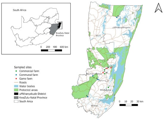 Subsistence farming is the most common farming practice in north-eastern KZN Province with numerous communal farms interspersed with several protected areas such as the provincial game parks, private game parks, and reserves [25] (Figure 1). The sampled areas form part of the Greater St Lucia Wetlands Park, a World Heritage Site where insect diversity is of conservation interest. The sampled areas were selected based on their proximity to protected areas, where there is a possible livestock–wildlife interface and previous historical tsetse infestation records. This area falls under the Savanna biome, composed of structural vegetation types ranging from sandy bushvelds, clay bushvelds, and coastal thornvelds [26]. Additionally, there are patches of wooded grassland that consist of plantations of exotic Eucalyptus sp. and Pinus sp. trees, which are mainly used for wood and paper [27]. These areas have frequent rains in the summer with annual mean precipitation ranging between 600 mm and 1050 mm [26]. The traps were set up in 10 localities divided into three land-use setups: communal farmlands, commercial farms, and private game farms (wildlife) (Figure 1).