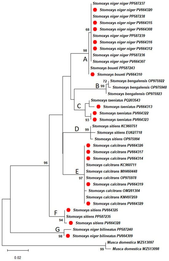 A maximum likelihood tree was constructed based on the GTR + G + I nucleotide substitution model for Stomoxys flies with Musca domestica as an outgroup, and samples from this study are represented in red color. The clades A-G represent: A: S. n. niger clade, B: S. bengalensis clade, C: S. taeniatus clade, D: S. sitiens clades from Asia, E: S. calcitrans clade, F: S. sitiens clades from Africa, and G: S. n. bilineatus clade.