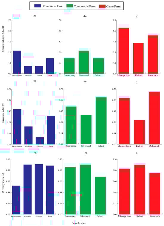 Species surrogates for Stomoxys composition comparing species richness (Chao1) for (a–c), heterogeneity (Shannon–Wiener diversity) for (d–f), and evenness (Simpson–Yule function) for (g–i) in communal, commercial, and game farms of north-eastern KwaZulu-Natal Province.