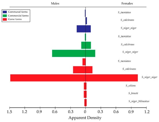 In this study, the apparent density and number of catches of Stomoxys differed between the trap locations and land-use setups. High apparent densities of Stomoxys flies were recorded from game and commercial farms where farming is intensive and there is availability of large number of suitable hosts and the abundance of suitable material to support their reproduction, such as animal droppings, which are the preferred egg-laying sites for these flies. In most cases, S. calcitrans and S. n. niger have been collected from the same sites in high numbers. This trend has been observed in almost all settings except in Ocilwane village, a communal farmland with the absence of S. calcitrans. The low frequency of Stomoxys flies in communal farmlands compared to the other settings can be explained by the open biotopes as secondary forest, savannah, or villages. In open areas, the abundance of Stomoxys spp. tends to decrease with distance from the livestock hosts [44]. The host density for blood-feeding adults and the suitable environmental conditions for larvae to complete their life cycle play a significant role in the abundance of these flies. This was seen in the current study, with high apparent densities observed at the private game farms due to the presence of various wildlife as potential blood meal sources. The current study shows that game farms are sites with the greatest diversity of Stomoxys flies, as exhibited by Mkonge and Zulucrock, which reported the presence of almost all six species in high abundance.
