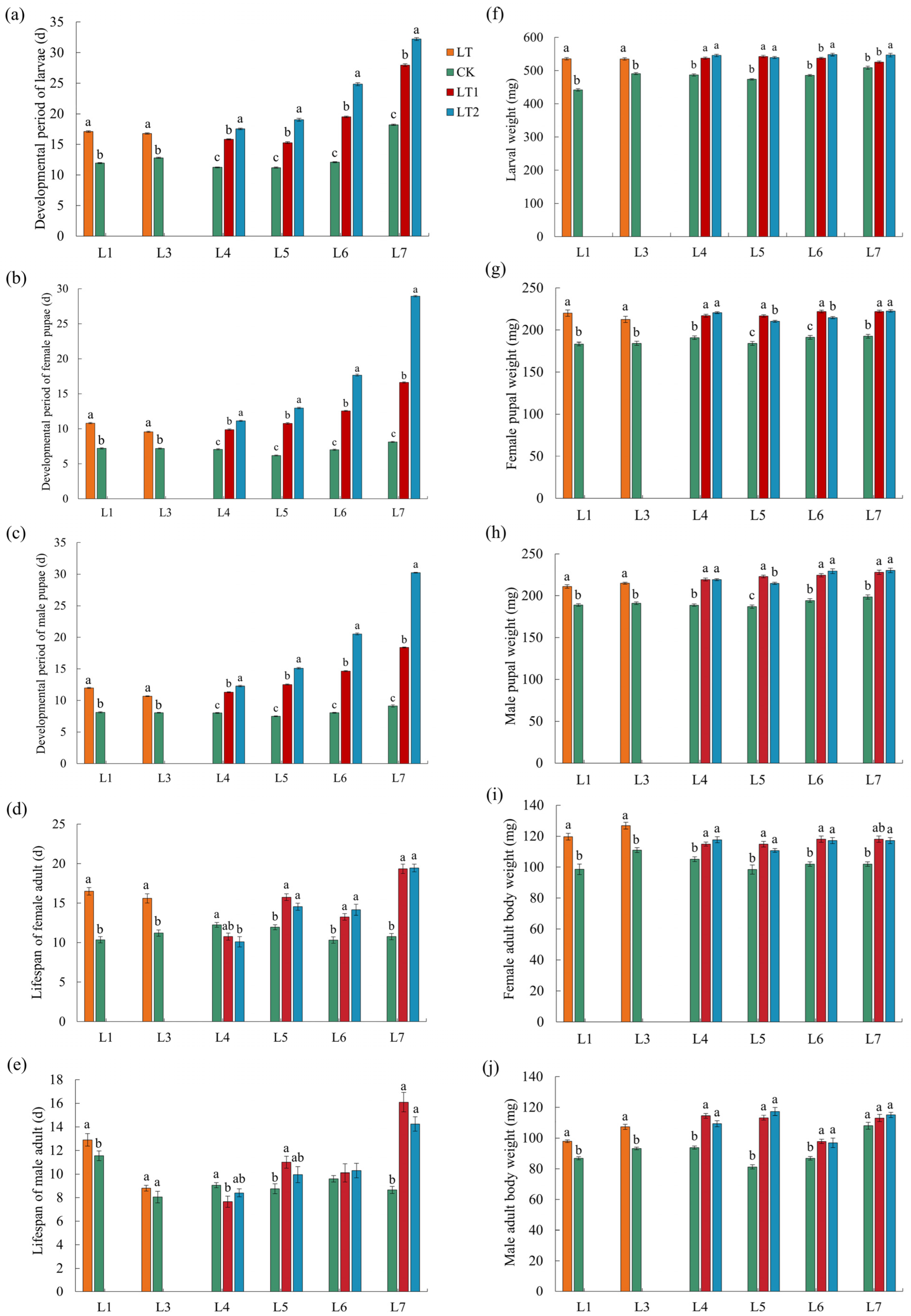- Quan, P.Q.; Guo, P.L.; He, J.; Liu, X.D. Heat-stress memory enhances the acclimation of a migratory insect pest to global warming. Mol. Ecol. 2024, 33, e17493. [Google Scholar] [CrossRef]