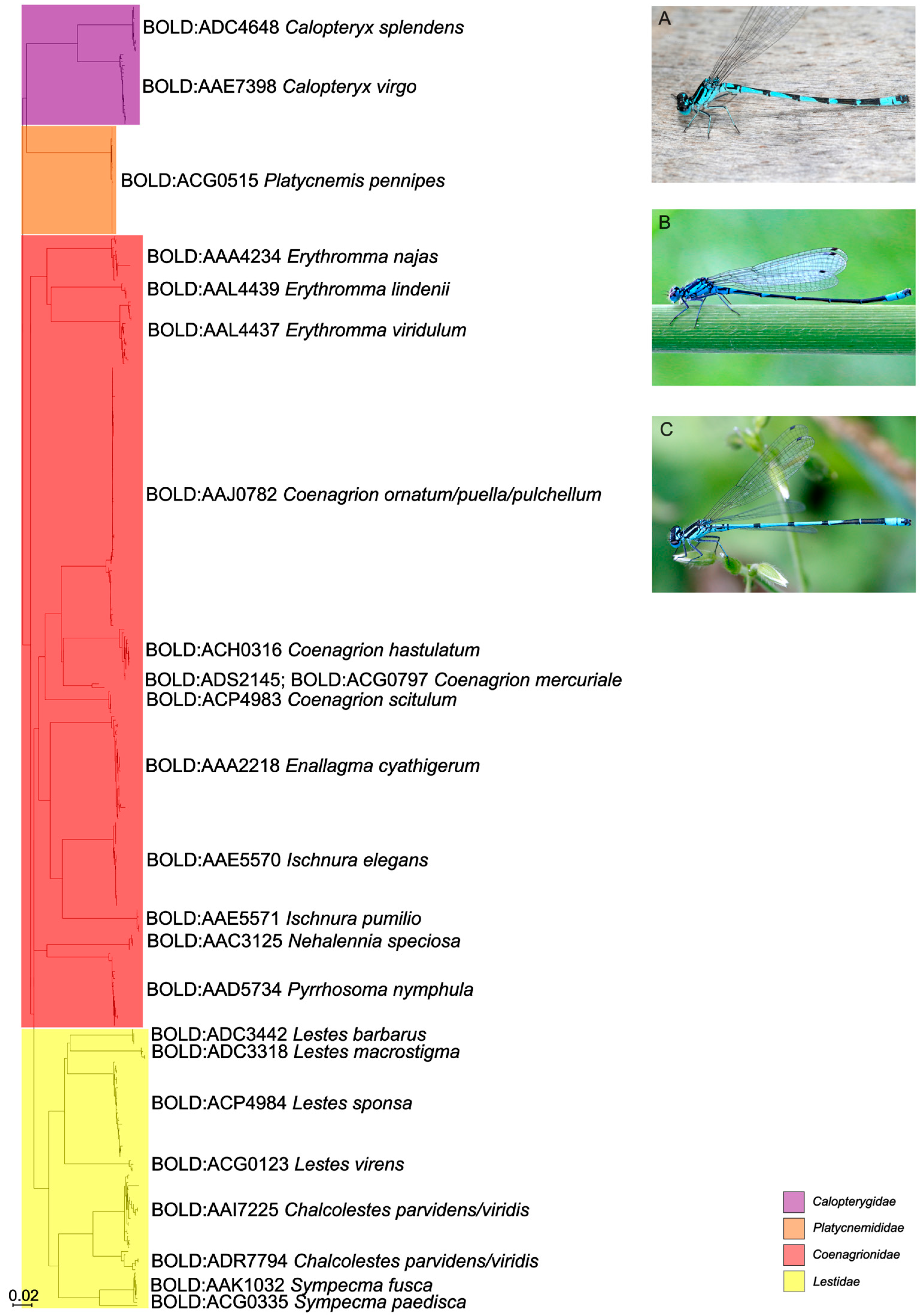 - Geiger, M.; Koblmüller, S.; Assandri, G.; Chovanec, A.; Ekrem, T.; Fischer, I.; Galimberti, A.; Grabowski, M.; Haring, E.; Hausmann, A.; et al. Coverage and quality of DNA barcode references for Central and Northern European Odonata. PeerJ 2021, 9, e11192. [Google Scholar] [CrossRef]
