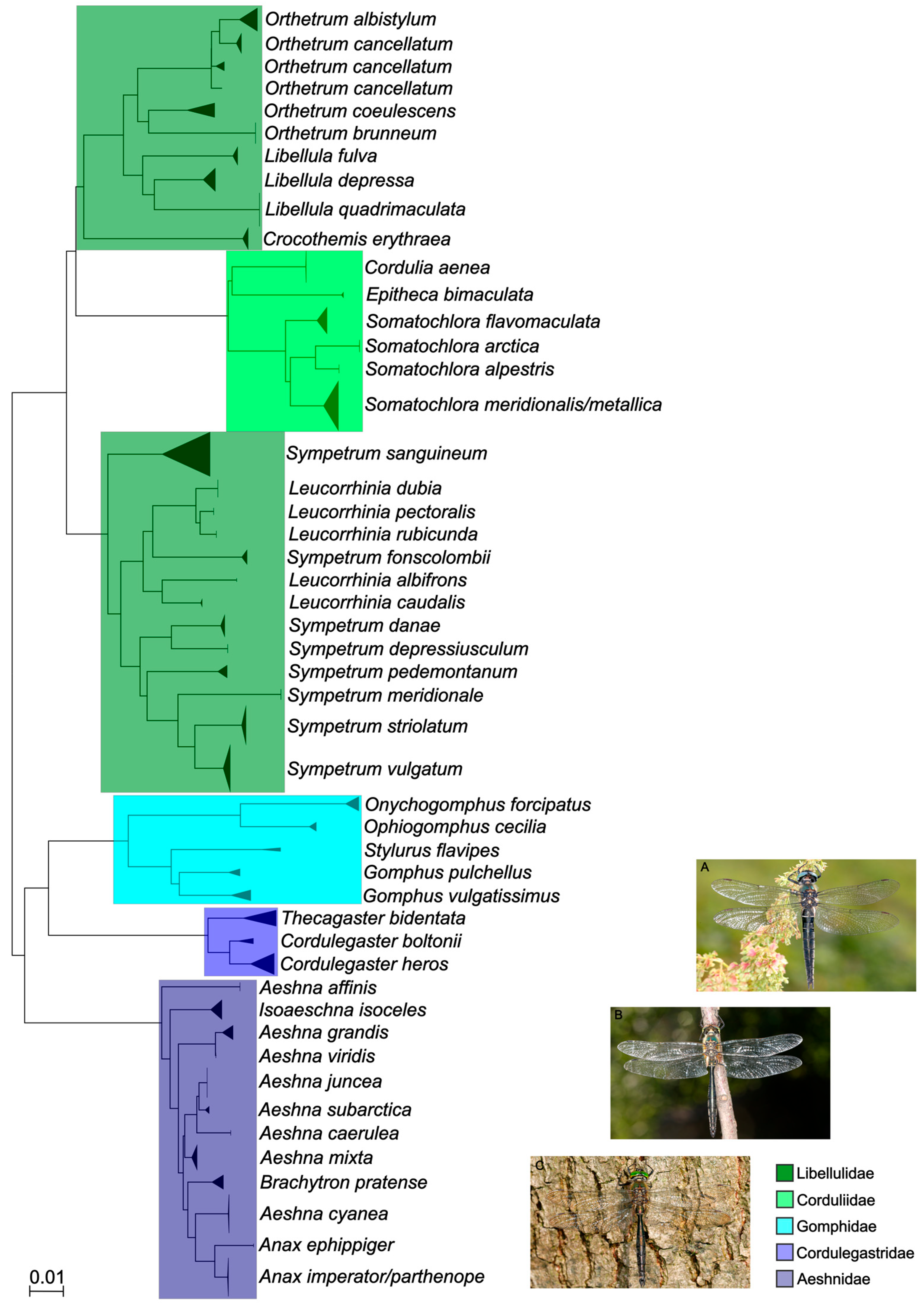 - Goodman, A.; Abbott, J.; Breinholt, J.W.; Bybee, S.; Frandsen, P.B.; Guralnick, R.; Kalman, V.J.; Kohli, M.; Newton, L.; Ware, J.L. Systematics and biogeography of the Holarctic dragonfly genus Somatochlora (Anisoptera: Corduliidae). Syst. Entomol. 2025, 50, 585–610. [Google Scholar] [CrossRef]