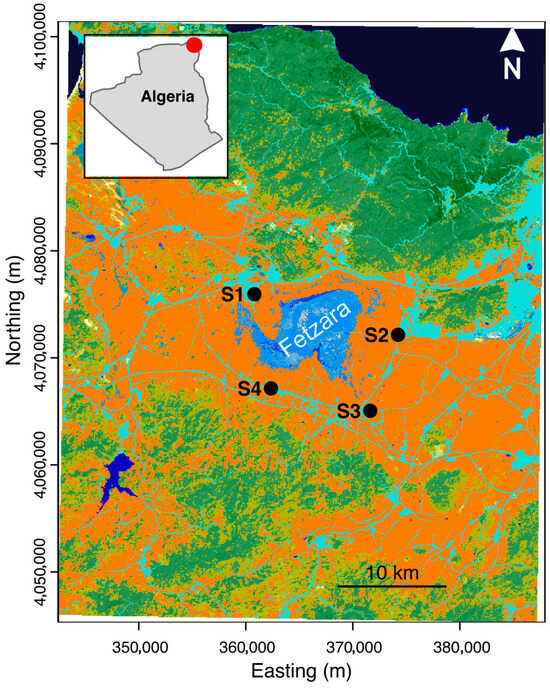 Map of our sampling sites in Fetzara Lake, Northeast Algeria. Northwest (NW: S1), Northeast (NE: S2), Southeast (SE: S3), and Southwest (SW: S4). The map was based on the Global land cover and land use 2020 (GLAD Landsat Analysis Ready Data).