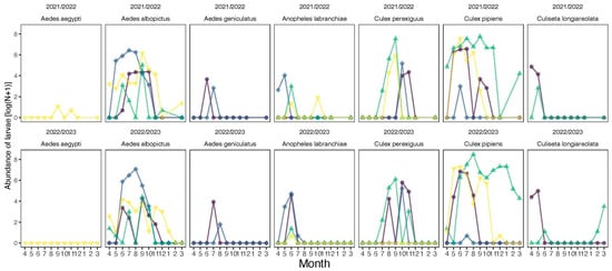The stability in Culicidae diversity across years suggests that mosquito community composition remained relatively unchanged, likely due to consistent climatic conditions in the region. Temperature and precipitation are two key environmental factors influencing mosquito diversity, as they directly affect breeding, survival, and dispersal patterns [83]. In Central Sweden’s lower River Dalälven region, a study across different wetland types over three years revealed that species richness of mosquito remained relatively constant, albeit with variability in abundance between years [84]. Temperature plays a crucial role in mosquito life cycles, influencing larval development rates, adult longevity, and reproductive success [79,85]. Warmer temperatures generally accelerate development, leading to faster population turnover, while extreme heat can be detrimental to survival [86,87]. Precipitation determines the availability of aquatic habitats for mosquito breeding [88]. Increased rainfall can create temporary water bodies favorable for certain species, while prolonged dry periods may reduce breeding sites and limit population growth [89]. However, stable precipitation patterns across years suggest a consistent availability of suitable habitats, further supporting a stable mosquito community composition.